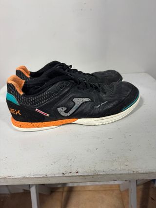 Zapatillas Joma para fútbol sala, modelo Top Flex. - Diseñadas para superficies indoor. - Combinación de colores negro y naranja.