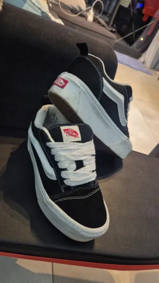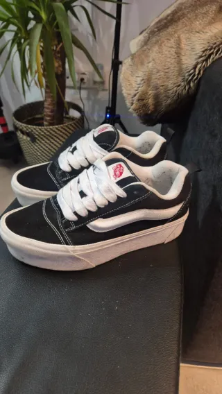 Zapatillas Vans Knu Stack con plataforma. Old school - Color negro y blanco. - Diseño de plataforma. - Cordones blancos. Como nuevas me las he puesto 5 veces, por dentro tiene bolitas del roce del calcetin, no lo he quitado pero con una cuchilla se quita, quedan muy bien puestas. Las vendo por que no son mi estilo y no me las pongo.