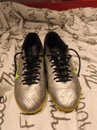 Zapatillas de fútbol plateadas con detalles en verde neón. - EUR 42/ US 8.5 - Diseño moderno y llamativo. - Cierre con cordones negros. - Suela con tacos para césped artificial.