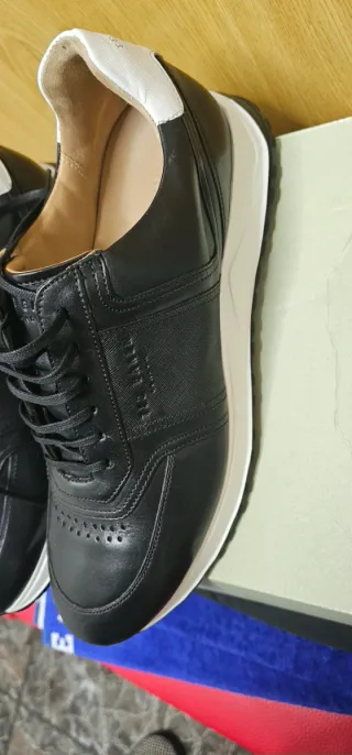 Elegantes zapatillas de Ted Baker London con un diseño moderno. Nuevas a estrenar Fabricadas en piel tanto exterior como parte interior. Talla 46 (29'5cm). - Combinación de colores negro y blanco. - Detalle de perforaciones en la puntera. - Cordones negros. - Suela blanca.