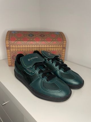 Zapatillas deportivas de la colección Puma x Harry Potter, inspiradas en la casa Slytherin. - Diseño en color verde esmeralda y negro. - Detalle del nombre Slytherin en la lengüeta. - Logo de Puma en el lateral. - Las lenguentas se pueden sacar como se ve en las fotos *La caja va incluida, esta nueva sin rasguños