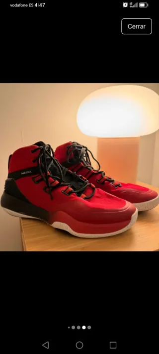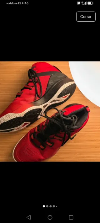 Zapatillas deportivas altas de Decathlon en llamativos colores rojo y negro. Perfectas para baloncesto o uso casual. - Diseño de caña alta. - Cordones negros. - Suela blanca y roja.