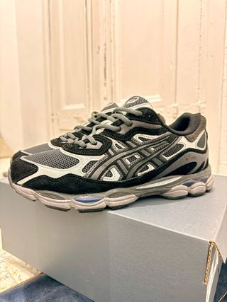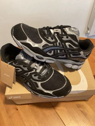Zapatillas deportivas Asics Gel NYC en color negro y plateado. Perfectas para correr o para el día a día. - Diseño moderno y deportivo.✅ - Combinación de malla y material sintético.✅ - Suela con amortiguación para mayor comodidad.✅ - Precio no negorciable❌