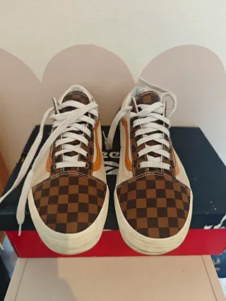 Zapatillas Vans con un diseño clásico y llamativo. - Patrón checkerboard en marrón y beige. - Detalles en naranja. - Cordones blancos.