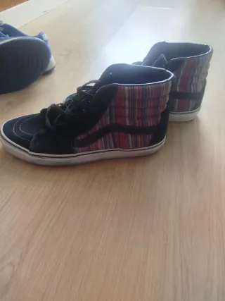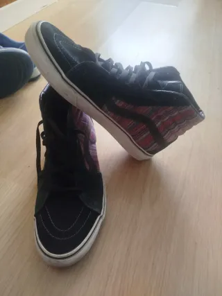 Zapatillas altas Vans SK8-Hi con un diseño llamativo. - Combinación de ante negro y tela estampada. - Cordones negros. - Suela blanca.
