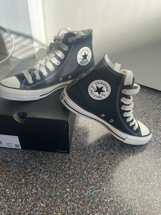 Zapatillas altas de la marca Converse en color negro. Un clásico para el día a día. - Material exterior de cuero. - Cierre con cordones. - Suela de goma.