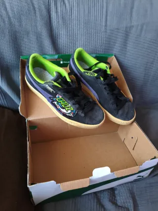 Zapatillas Puma Suede con diseño de Santa Cruz. - Color principal negro con detalles en verde y morado. - Logo de Puma Suede en el lateral. - Estampado gráfico de Santa Cruz.