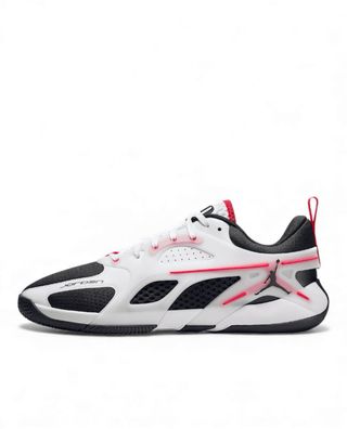 Zapatillas de entrenamiento Jordan Heir Series en blanco y negro. caja sin tapa. - Diseño moderno y deportivo. - Detalles en rojo vibrante. - Logo de Jordan visible.