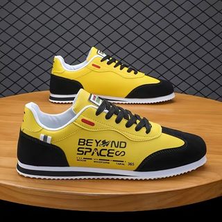 Zapatillas deportivas de estilo casual para hombre, con un diseño moderno y llamativo. - Combinación de colores amarillo y negro. - Cierre con cordones. - Suela blanca con detalles negros. "BEYOND SPACE", suela de goma y forro de tela cómodo para uso al aire libre en todas las estaciones, calzado casual | Zapatillas gráficas audaces | Suela de goma duradera