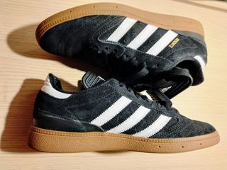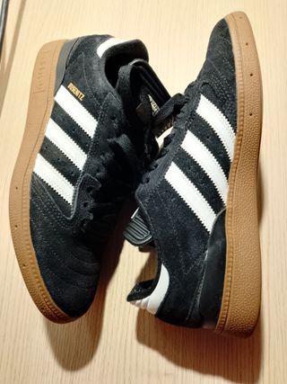 Zapatilla Adidas Busenitz en color negro con detalles en blanco y suela marrón. - Parte superior de ante. - Tres rayas laterales blancas. - Suela de goma marrón. - Cierre de cordones.