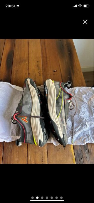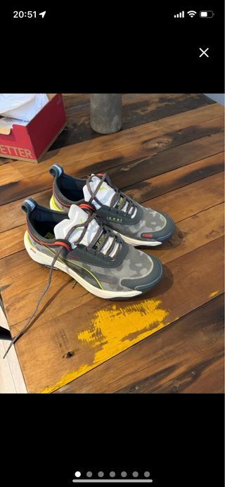 Zapatillas Puma sin estrenar, con un diseño moderno y detalles llamativos. - Patrón de camuflaje gris y multicolor. - Cordones grises y blancos. - Detalle de color amarillo en el talón. - Suela blanca con detalles en gris y amarillo.