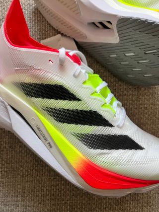 Zapatillas deportivas Adidas Adizero Boston 12. - Diseño moderno con detalles en rojo y amarillo neón. - Parte superior de malla transpirable. - Suela con tecnología Lightstrike Pro.