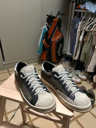 Zapatillas de la marca P448. - Modelo de talla 44. - Combinación de colores beige y gris.