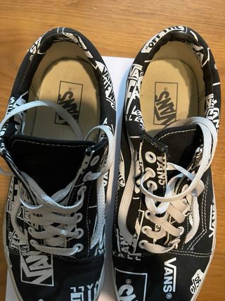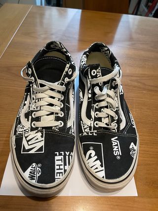 Zapatillas Vans con un diseño llamativo y original. - Estampado de logos y texto en blanco y negro. - Cordones blancos. - Suela de goma. - Compradas en Nueva York.