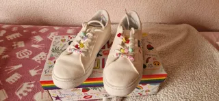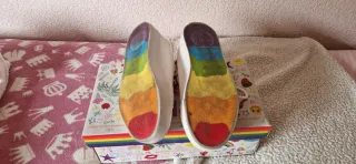Zapatillas Timpers con un diseño único y lleno de color. Perfectas para expresar tu estilo. - Decoradas con abalorios y cuentas. - Mensajes de LOVE y PRIDE en las zapatillas. - Cordones blancos con detalles arcoíris.