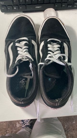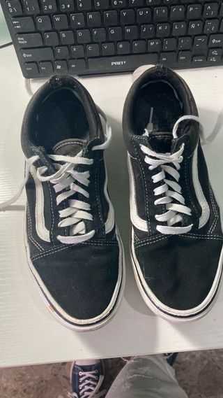 Zapatillas Vans Old Skool en color negro y blanco con el logo clásico. Son un poco justas, por lo que se recomiendan para una talla 39. - Diseño clásico con la franja lateral. - Cierre con cordones blancos. - Suela de goma. -Tiene manchas y están desgastadas pero por lo demás bien *PRECIO NO NEGOCIABLE YA ESTÁ BAJO*
