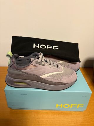 Zapatillas deportivas HOFF modelo GUELL en talla 38. - Combinación de tonos grises y morados. - Detalle de suela con cámara de aire. - Incluye bolsa protectora de tela negra con logo HOFF. - En su caja original.
