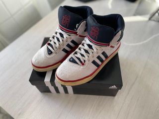 Zapatillas Adidas hombre, talla 43 1/3, estilo bota, blancas con detalles azules y rojos. Como nuevas sin etiquetas, poco uso