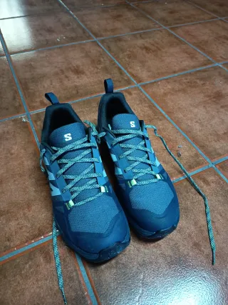 Zapatillas Salomon para senderismo, con un diseño moderno y funcional. - Combinación de colores azul y gris. - Cierre con cordones. - Tirador en el talón para facilitar su colocación. Me las he puesto una sola vez las vendo porque me han regalado unas superiores
