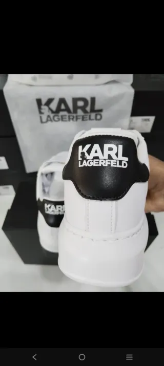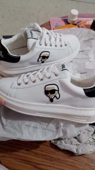 Zapatillas de la marca Karl Lagerfeld con un diseño moderno y llamativo. - Combinación de blanco y negro. - Detalle del personaje Karl Lagerfeld. - Cierre con cordones.