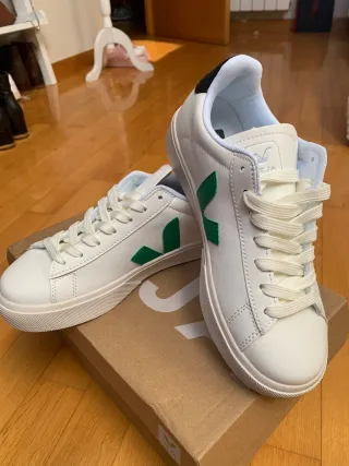 Zapatillas de la marca Veja en color blanco con detalles verdes. - Modelo de zapatillas deportivas. - Cierre con cordones.