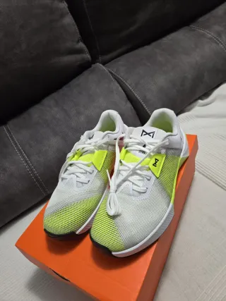 Zapatillas deportivas Nike Metcon 10. Unisex - Diseño en blanco y verde neón. - Cierre con cordones. - Logo de Nike en el lateral.