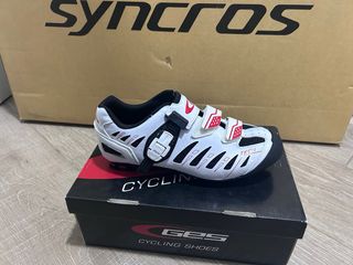 Zapatillas de ciclismo GES en color blanco con detalles en rojo. Cuentan con un sistema de cierre de velcro para un ajuste seguro. - Cierre de velcro. - Diseño deportivo.