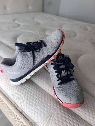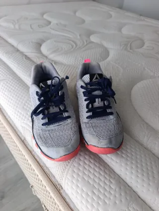 Zapatillas deportivas Reebok en color gris-lila con detalles en rosa. - Talla 35.5. - Medida de 22.5 cm.
