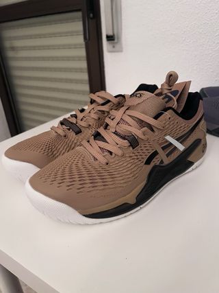 Zapatillas deportivas Asics Gel Resolution 9 en colaboración con BOSS. Talla 43,5 nuevas a estrenar. Para tenis o padel - Diseño moderno en tonos marrones y negros. - Detalles de marca Asics y BOSS. - Suela blanca con detalles en negro. Bullpadel head wilson nox adidas babolat nike