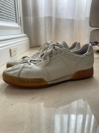 Zapatillas de la marca Reebok con un diseño clásico. - Exterior de cuero blanco. - Suela de goma marrón. - Cordones blancos.