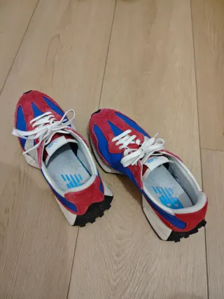 Zapatillas deportivas New Balance modelo 327 en talla 42. - Paneles en gamuza granate y tela azul - Cordones blancos - Suela de goma # zapatos sneakers sport deporte Nike Air Jordan Adidas Reebok Converse Vans Onitsuka Tiger Asics casual look