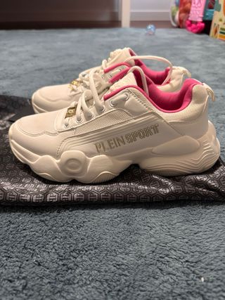 Zapatillas deportivas de la marca Philipp Plein usado solo una vez - Diseño moderno en blanco con detalles en rosa. - Cierre con cordones. - Suela gruesa y cómoda. • Plein Sport • zapatillas Plein Sport • Philipp Plein • zapatillas de marca • zapatillas deportivas • sneakers • calzado deportivo • zapatillas urbanas • moda urbana • estilo streetwear • lujo deportivo • zapatillas originales