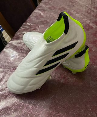 Zapatillas de fútbol para niño con un diseño moderno y llamativo. - Exterior blanco con detalles en negro y verde neón. - Cierre sin cordones para un ajuste rápido. - Suela con tacos para césped. - Interior forrado en verde neón.