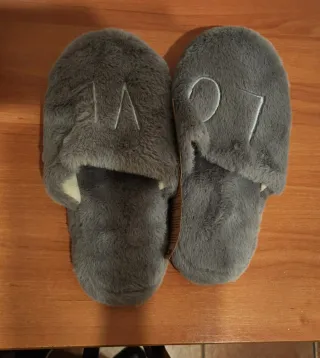 Pantuflas zapatillas de pelo muy suaves y cómodas. - Diseño con letras bordadas LOVE - Talla 38-39. en gris con texturas suaves y suelas antideslizantes de caucho natural.