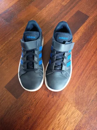Zapatillas deportivas Adidas para niño en color azul. - Cierre de velcro y cordones. - Detalle de las tres rayas en los laterales. Muy poco uso Talla 32