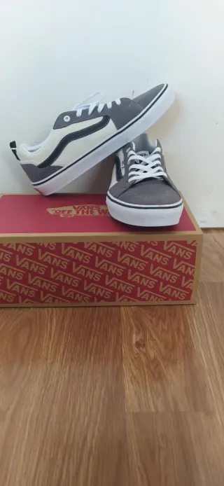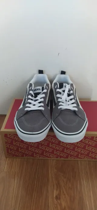 Zapatillas de la marca Vans con suela de goma. - Parte superior de ante gris. - Raya lateral blanca. - Suela de goma marrón.