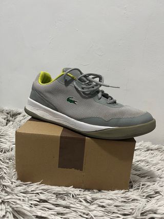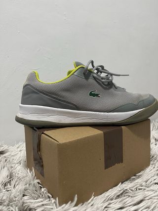 Zapatillas deportivas de la marca Lacoste en color gris. En buenas condiciones, poco uso. Una pequeña tara en la puntera que no se pueda solucionar. - Diseño moderno y cómodo. - Cierre con cordones. - Sin caja. - Detalle del logo de Lacoste.