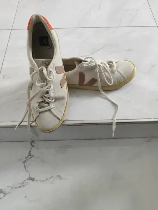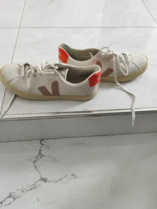Zapatillas de lona de la marca Veja. - Color principal beige con detalles en naranja. - Diseño de corte bajo con cordones. - Logo de la marca en los laterales. Solo me las he puesto tres veces.