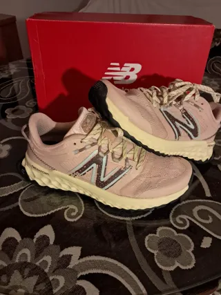 Zapatillas de trail running New Balance en tonos beige y rosa. Perfectas para tus aventuras al aire libre. - Diseño deportivo y moderno. - Suela con buen agarre. - Detalle de logo en el lateral.