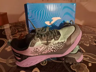 Zapatillas de trail running para mujer con un diseño moderno y llamativo. - Combinación de colores morado y verde. - Marca Joma.