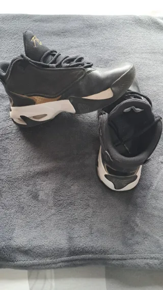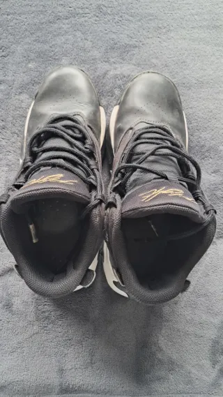 Zapatillas deportivas de baloncesto con un diseño moderno. - Combinación de colores negro y dorado. - Cierre con cordones para un ajuste seguro. - Diseño de caña alta para mayor soporte.