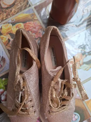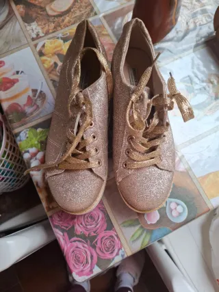 Zapatillas con un acabado brillante y detalles de purpurina. - Diseño con cordones. - Interior con etiqueta de la marca. - Suela cómoda. 3 veces de usar