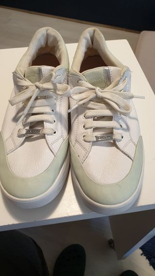Zapatillas Geox originales, talla 42, blancas con detalles en tono verde agua claro. Son de piel y muy cómodas. Están usadas, con señales normales de uso visibles en fotos, pero todavía les queda mucha vida.