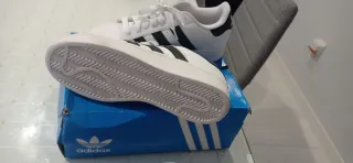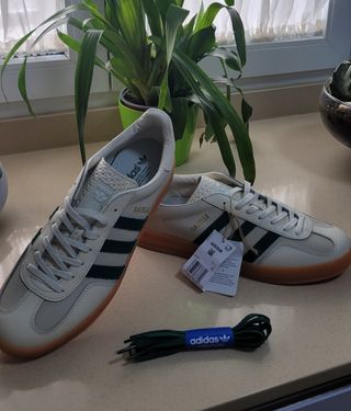 Zapatillas Adidas Gazelle nuevas a estrenar. Diseño clásico en color blanco/crema, con tres bandas en verde oscuro y suela de goma color caramelo. Cómodo y fácil de combinar para el día a día. 🔹 Estado: Nuevas, sin uso 🔹 Con etiqueta original 🔹 Con caja original y accesorios Un modelo icónico de Adidas, perfecto para uso casual o diario.