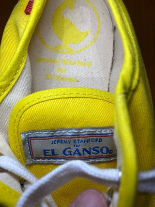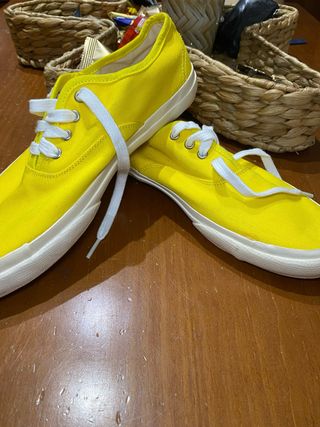 Zapatillas de lona de color amarillo brillante. - Cierre con cordones blancos. - Suela de goma blanca. - Diseño clásico de zapatilla de lona.