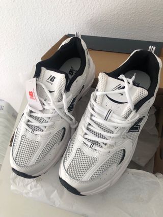 Zapatillas New Balance 530 en blanco y negro. Diseño deportivo y moderno. - Parte superior de malla transpirable. - Detalle de logo N en el lateral. - Suela con tecnología ABZORB.