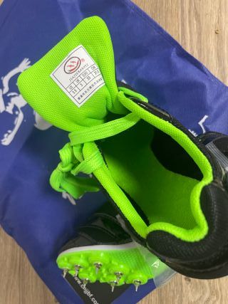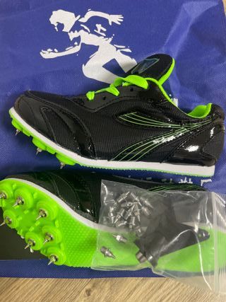 Zapatillas de atletismo con clavos, ideales para carreras, talla 33 - Diseño en color negro con detalles en verde lima. - Incluye bolsa para guardarlas y juego de clavos de repuesto.