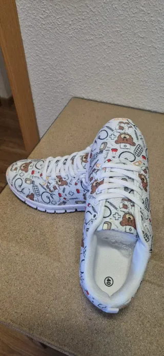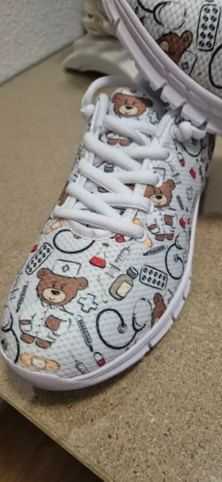 Zapatillas cómodas con un divertido estampado sanitario. Perfectas para el día a día. Talla 40 pero viene mas bien pequeño adjunto foto de lo que mide la plantilla 26.5 cm - Diseño con ositos y símbolos médicos. - Suela blanca. - Cordones blancos.