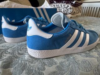 Zapatillas deportivas Adidas Gazelle en color azul y blanco. Yo tengo en todos los zapatos de normal un 39 y en otras hasta un 40 pero en la mayoria de las adidas de este tipo utilizo el 38 y medio. Me las he puesto poco ya que me las compre en sevilla en el lagooh. Tienen un color muy bonito y por eso me llamaron la atencion, destaca mucho pero son muy ponibles para el dia a dia. Cordones y todo originales. - Diseño icónico de tres rayas. - Detalle del nombre Gazelle en el lateral. - Suela de goma. - Cierre con cordones.