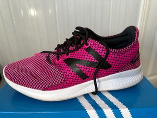 Zapatillas deportivas New Balance en llamativo color fucsia con detalles en negro. - Diseño moderno y deportivo. - Cierre con cordones negros. - Suela blanca. - Logo de la marca en negro. - Ligeras. - Talla 38.